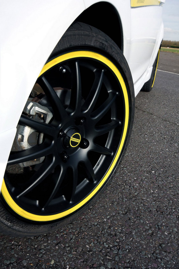 Мощное авто должно иметь соответствующий вид – Mountune в дополнение к апгрейду производительности предлагает бодикит для Ford Fiesta, состоящий из переднего спойлера (нижней губы бампера), боковых юбок, заднего спойлера, диффузора с интегрированными сдвоенными выхлопными трубами, желтых декалей и накладок на зеркала, а также вороненных легкосплавных колесных дисков с желтыми ободами.